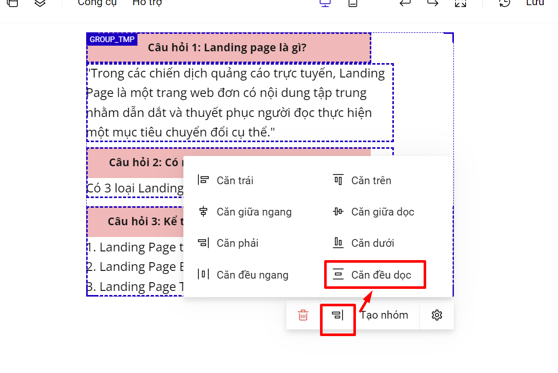 Sau đó bạn quét chuột cho toàn bộ các nhóm câu hỏi và câu trả lời, chọn căn đều dọc để được hiển thị đẹp.