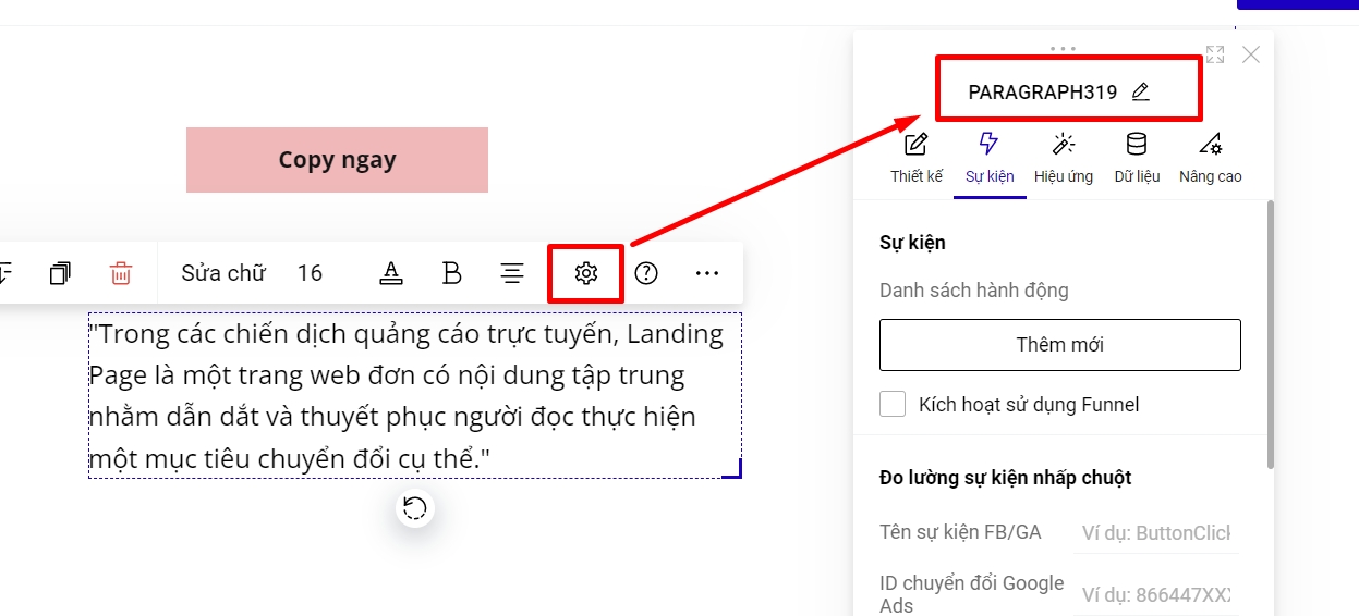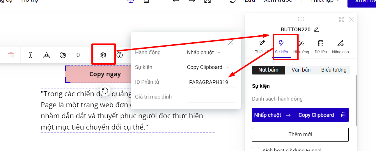 Ví dụ bạn muốn khách bấm vào nút bấm Copy Ngay sẽ ra nội dung đoạn text ở dưới, bạn có thể sao chép ID đoạn text rồi dán vào mục ID phần tử của phần cài đặt của sự kiên Copy Clipboard.