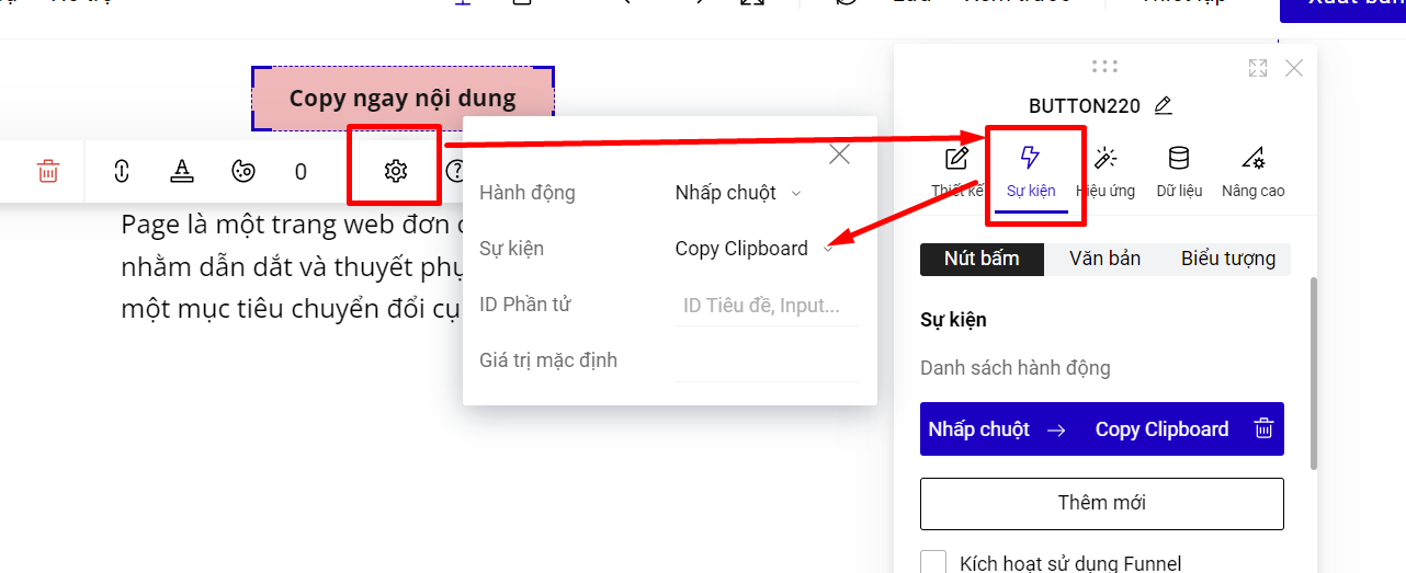 Bạn vào phần Thiết lập của phần tử--> chọn Sự kiện--> Hành động nhấp chuột --> Clipboard--> Nhập ID phần tử bạn muốn khách hàng bấm vào sẽ sao chép nội dung phần tử đó hoặc điền Giá trị mặc định.