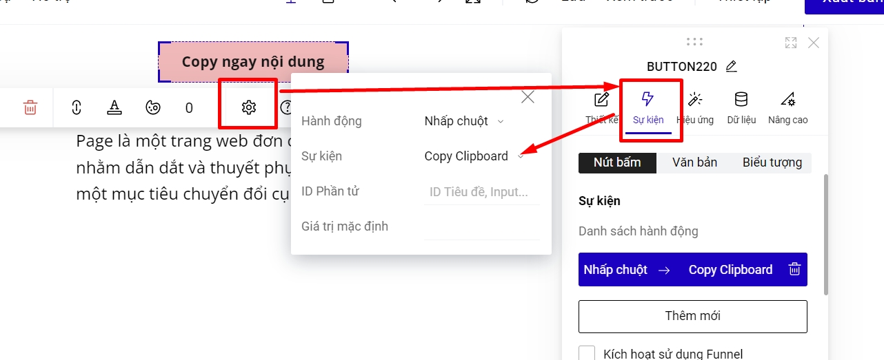 Sự kiện này cho phép bạn khi click vào 1 phần tử thì sẽ copy lại được nội dung bạn đã thiết lập trong mục sự kiện.