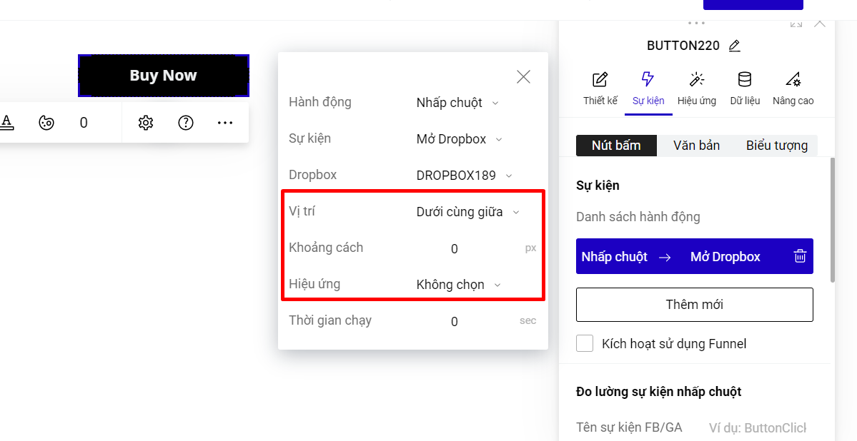 Sau khi chọn được Dropbox sẽ hiển thị, bạn chọn thiết lập Vị trí, Khoảng cách (so với phần tử liên kết đến Dropbox) và Hiệu ứng.