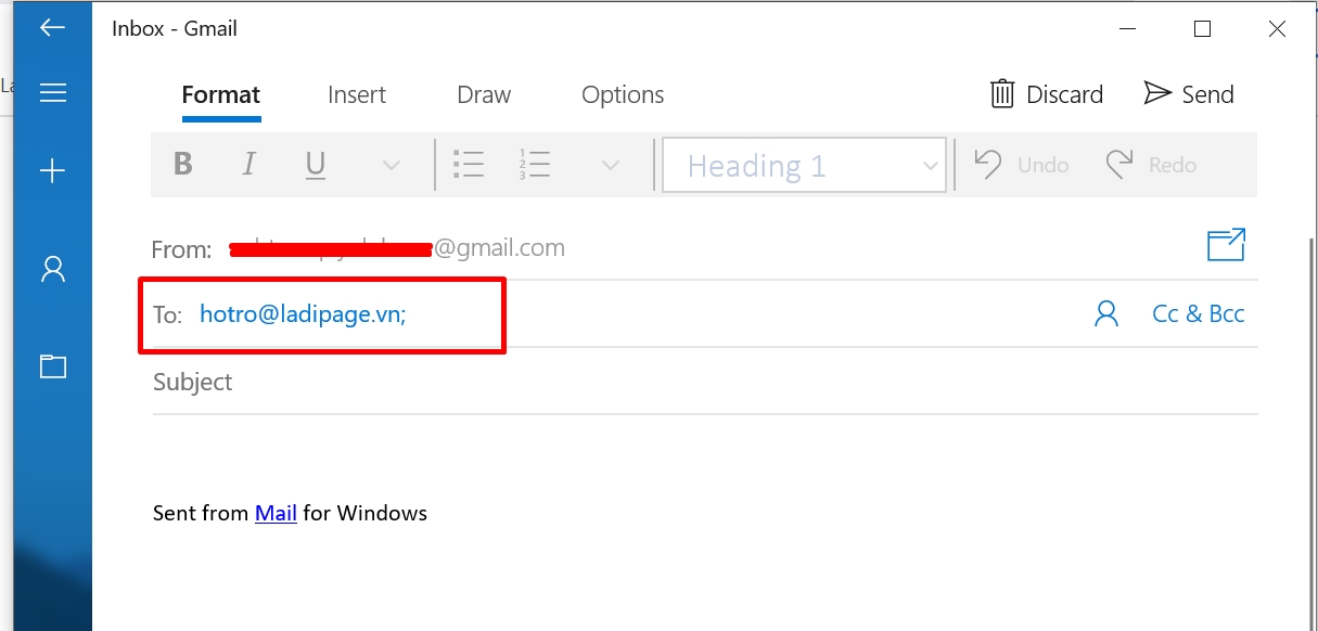 Ví dụ trong cài đặt ở trên, email được gửi đến sẽ là email hotro@ladipage.vn.