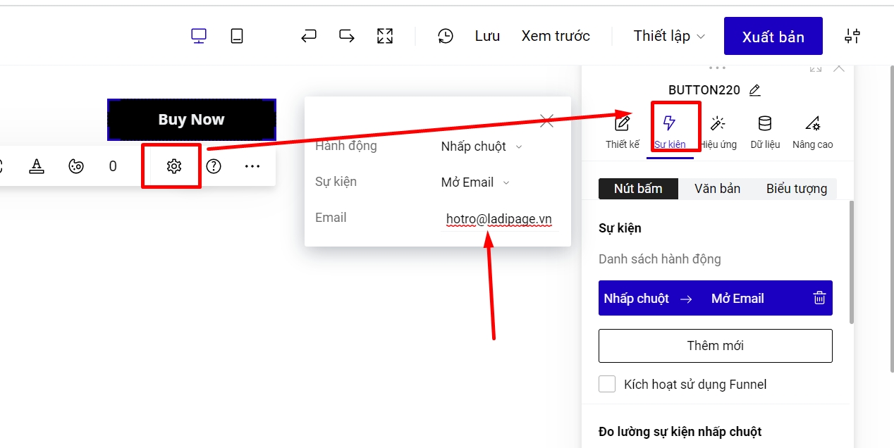 Bạn vào phần Thiết lập của phần tử--> chọn Sự kiện--> Hành động nhấp chuột --> Mở Email--> Nhập email muốn khách hàng gửi thư đến.