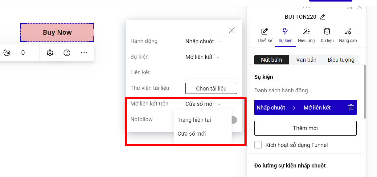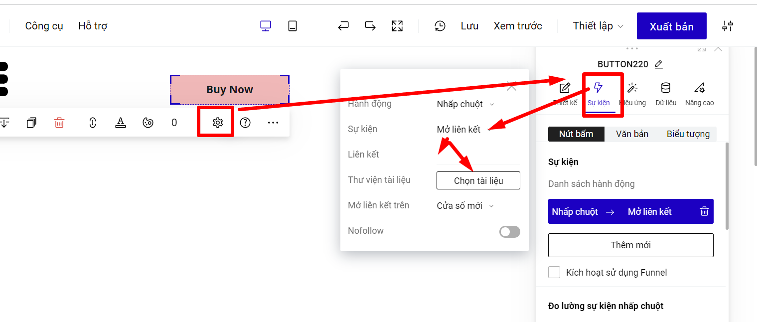 Tính năng này giúp bạn thiết lập chuyển hướng sang trang khác, hoặc các file tài liệu mà bạn muốn người dùng có thể tải về khi người dùng bấm vào một phần tử. Để thực hiện, bạn làm theo hướng dẫn như ảnh dưới đây: