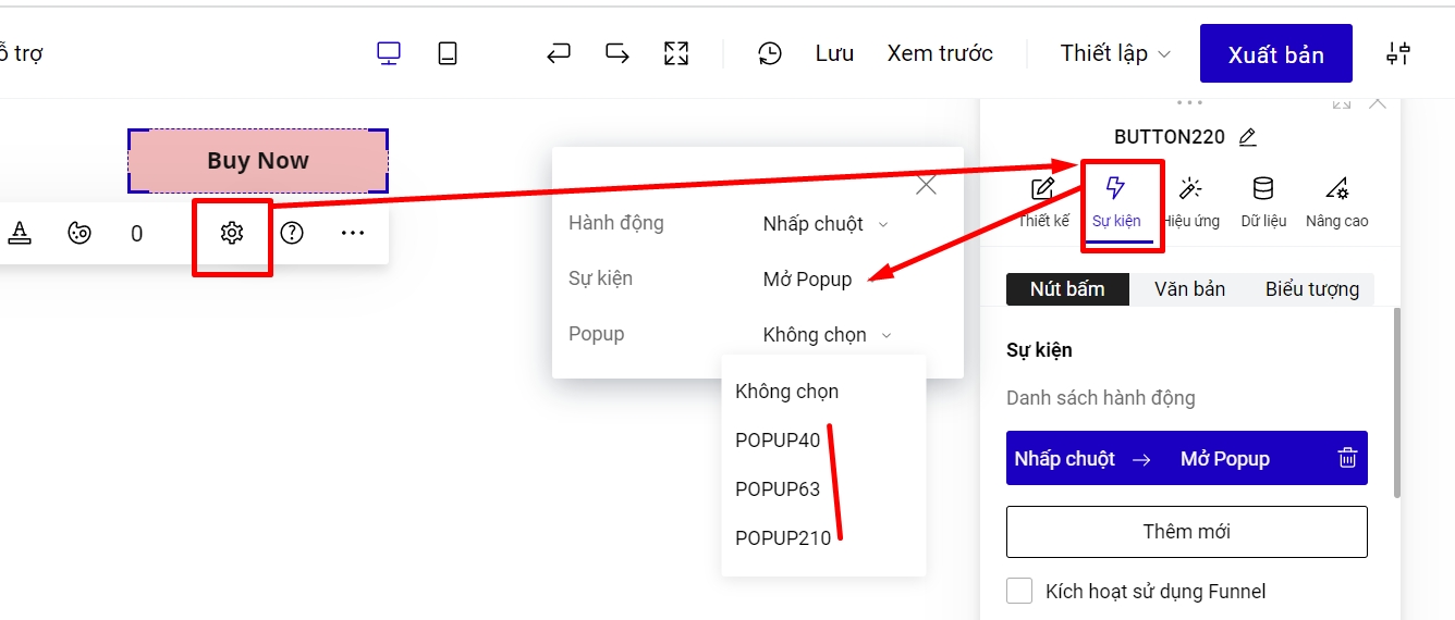 Bước 2: Bạn vào phần Thiết lập của phần tử muốn đi sự kiện mở popup--> Sự kiện--> chọn Hành động Nhấp chuột --> chọn ID Popup đã kiểm tra ở bước 1.
