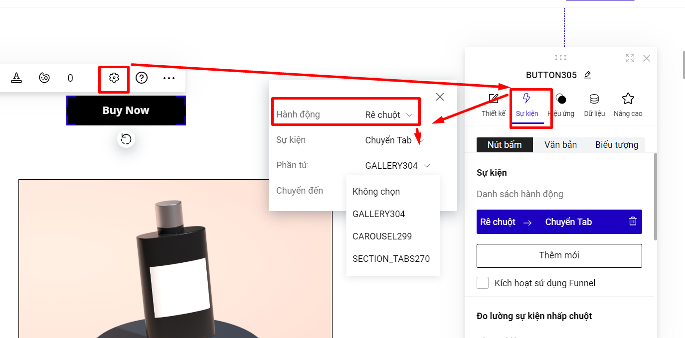 Bạn chọn Gallery, Carousel ,Tabs, Section Tabs mà muốn thiết lập sự kiện chuyển tab rồi chọn sự kiện chuyển đến tương ứng.