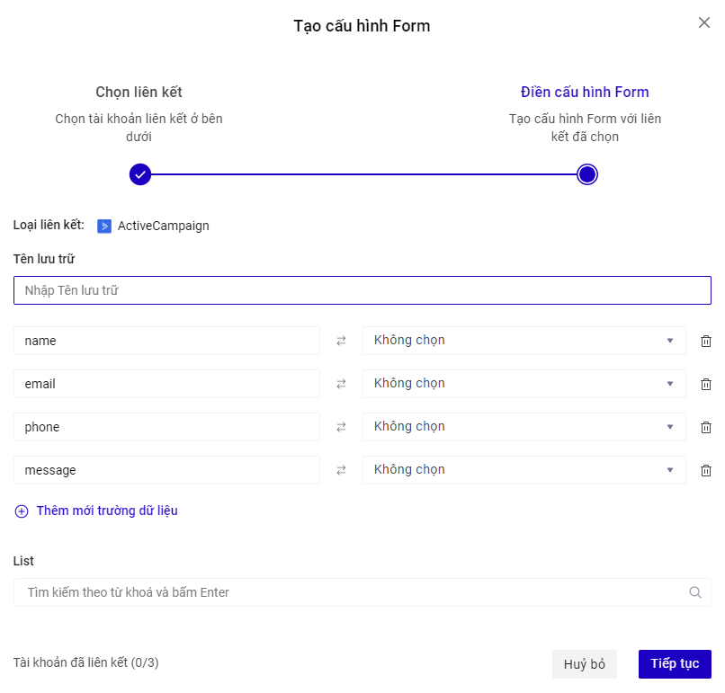 Truy cập trang builder.ladipage.comarrow-up-right, chọn menu Landing Pages -> Cấu hình form-> Tạo cấu hình form -> Form data -> Tạo tài khoản liên kết .Sau đó lựa chọn Loại tài khoản là ActiveCampaign
