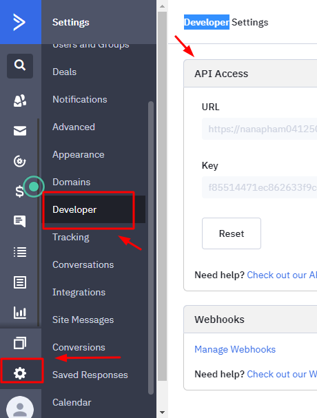 Đăng nhập tài khoản ActiveCampaign-> Tài khoản ( góc dưới cùng bên tay trái )->Developer