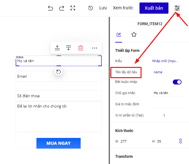 Quay trở lại form trên trang Landing Page, chọn toàn form bạn đang muốn cài đặt và chọn "Lưu data":