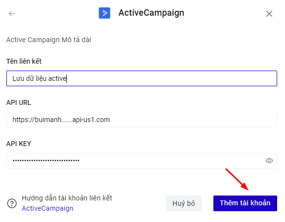 API URL, API KEY là api kết nối lấy trong tài khoản ActiveCampaign của bạn.