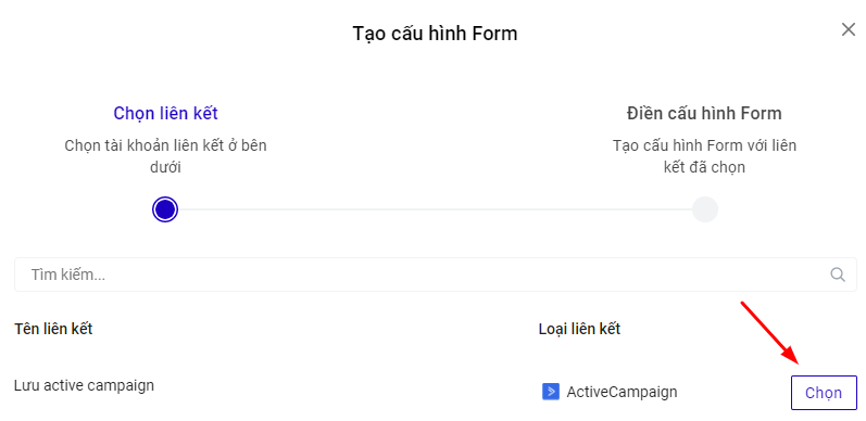Cách 3: Truy cập builder chỉnh sửa trang landingpage muốn lưu data về Active Campaign, ở phần Form đăng ký, mục Lưu data --> bấm Thêm mới --> chọn Tạo liên kết --> Loại tài khoản là Active Campaign.