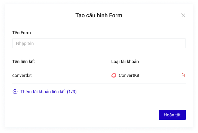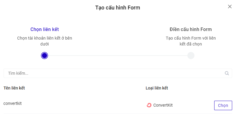 Truy cập trang builder.ladipage.com, chọn menu Landing Pages -> Cấu hình form-> Tạo cấu hình form -> Form data -> Tạo tài khoản liên kết .Sau đó lựa chọn Loại tài khoản là ConvertKit