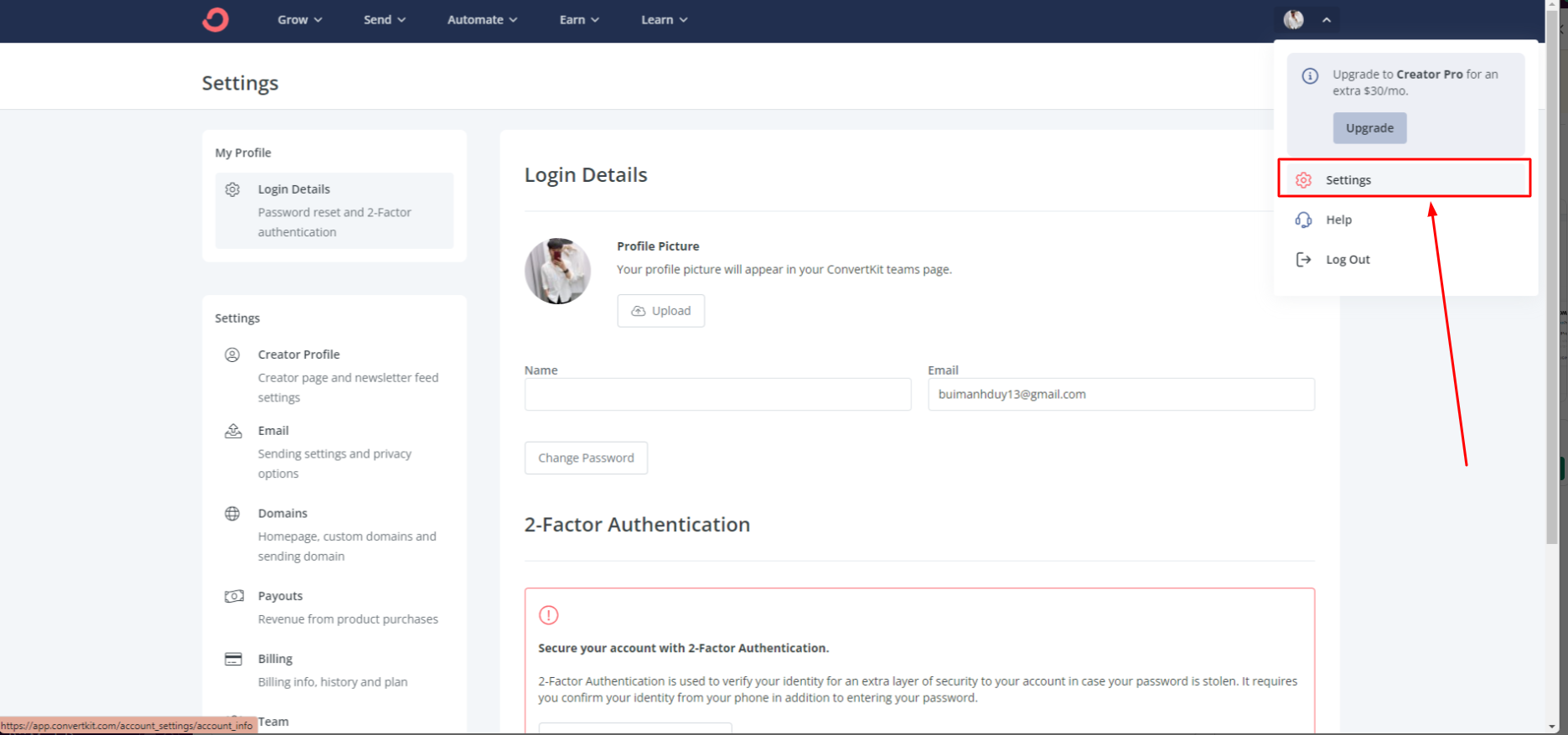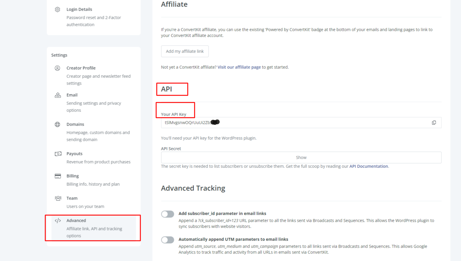 Đăng nhập tài khoản Convertkit -> Settings-> Advanced