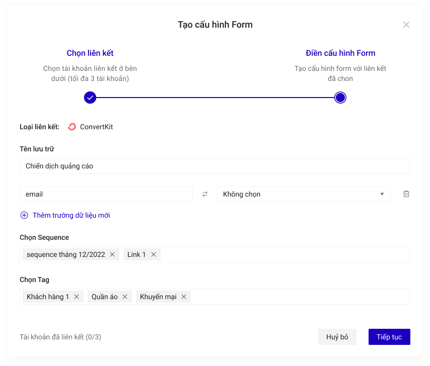 Bạn có thể chọn thêm tài khoản liên kết khác cho Cấu hình này. Mỗi cấu hình được chứa tối đa 3 tài khoản liên kết, tương đương với 3 nguồn lưu trữ thông tin khách hàng đồng thời nhận được từ form đăng ký trên Landing Page.