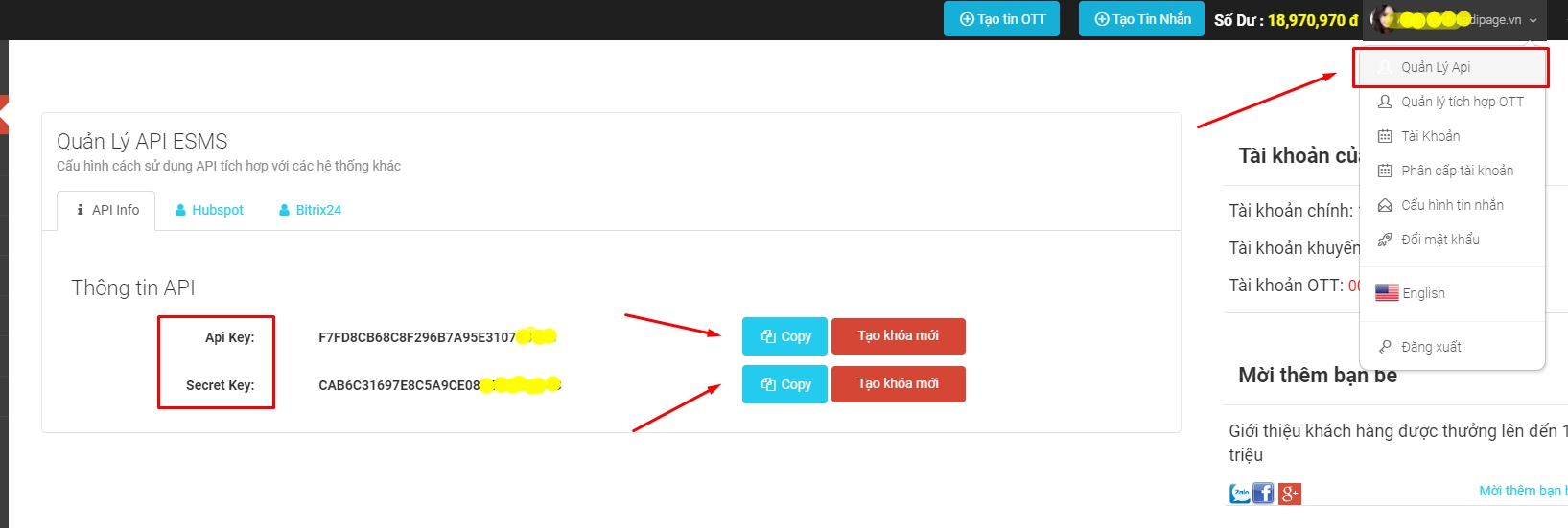 API KEY, Secret Key : là key kết nối lấy trong tài khoản eSMS của bạn