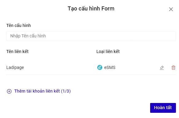Bạn có thể chọn thêm tài khoản liên kết khác cho Cấu hình này. Mỗi cấu hình được chứa tối đa 3 tài khoản liên kết, tương đương với 3 nguồn lưu trữ thông tin khách hàng đồng thời nhận được từ form đăng ký trên Landing Page.