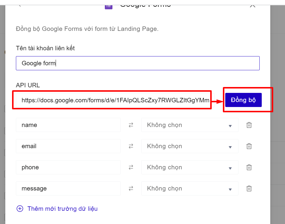 • Nhập API URL là đường dẫn của Google Form là đường dẫn sao chép ở phần I. Cách tạo google form. --> Bấm đồng bộ.