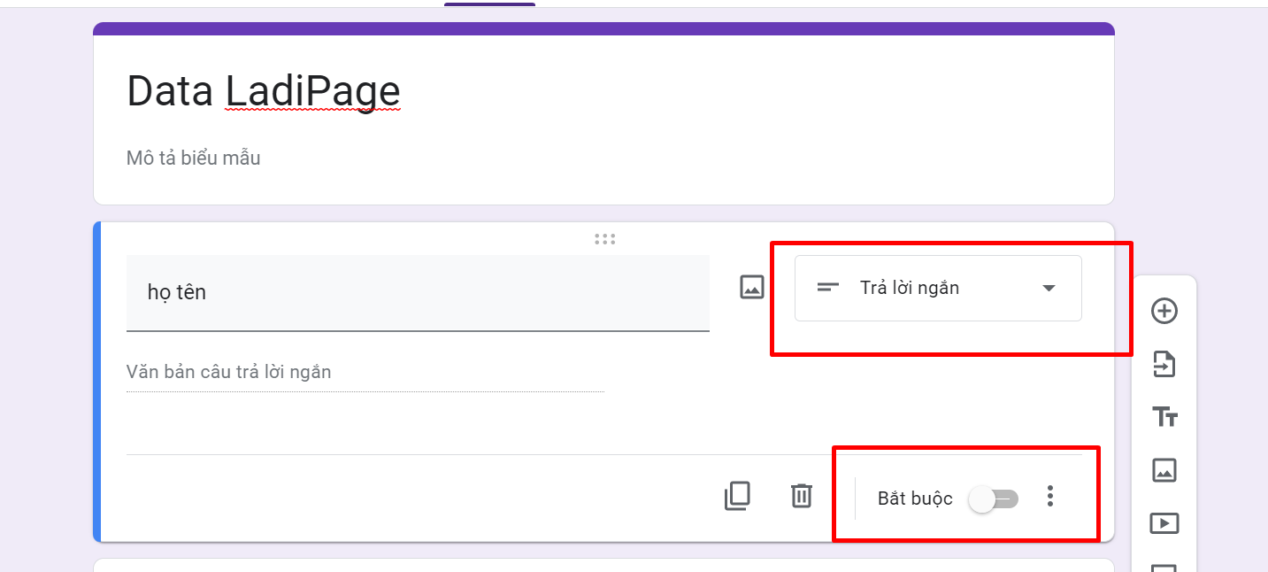 Bên phải là các trường thông tin bạn tạo trên Google Form