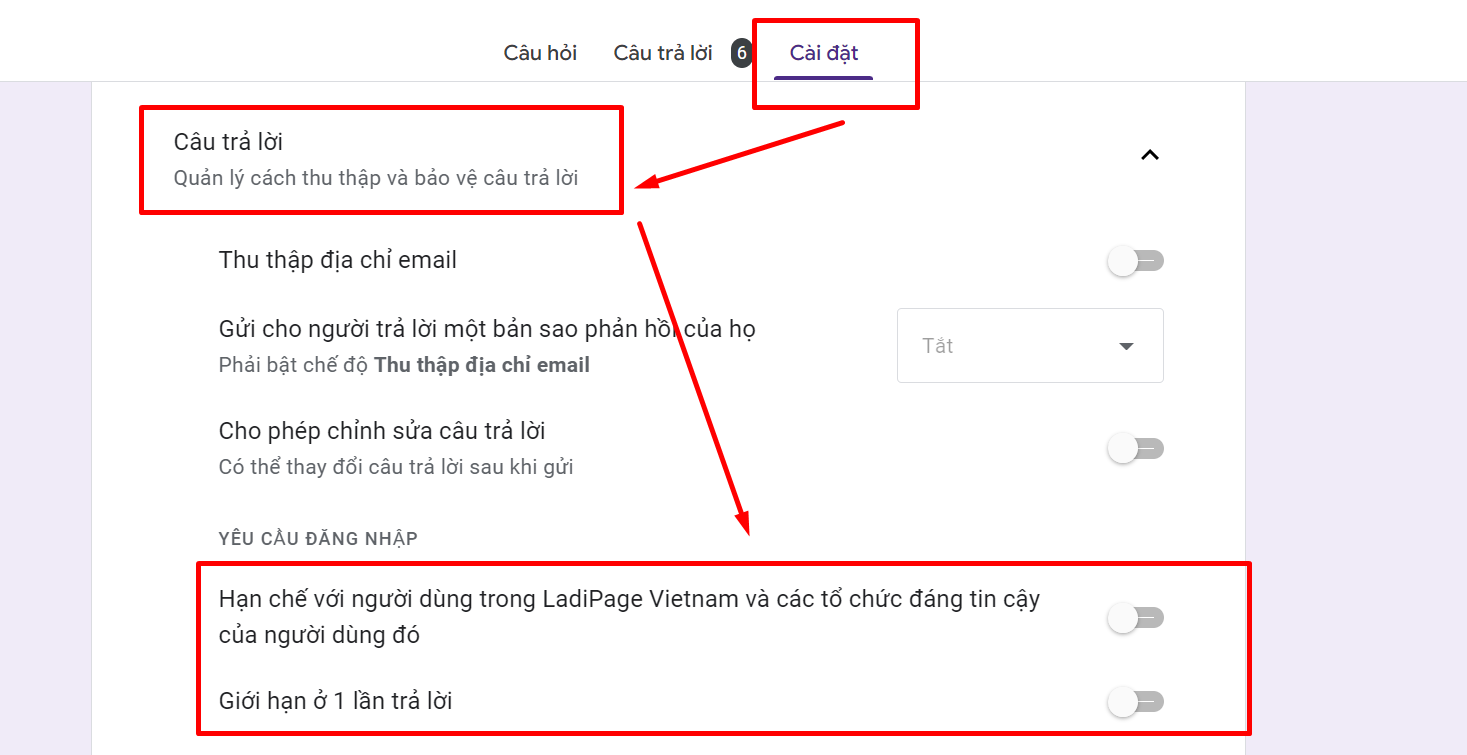 • Phần cài đặt của google form --> Câu trả lời --> Phần Yêu cầu đăng nhập --> Bỏ tích chọn Hạn chế như ở bên dưới.