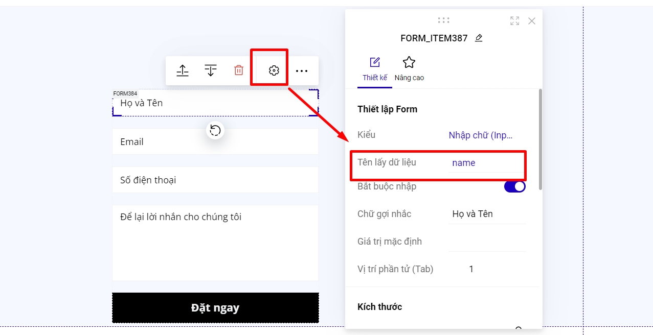 Quay trở lại form trên trang Landing Page, chọn toàn form bạn đang muốn cài đặt và chọn "Lưu data":
