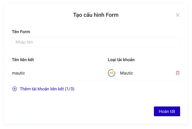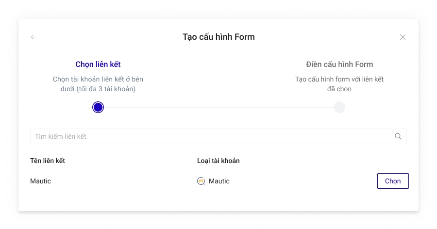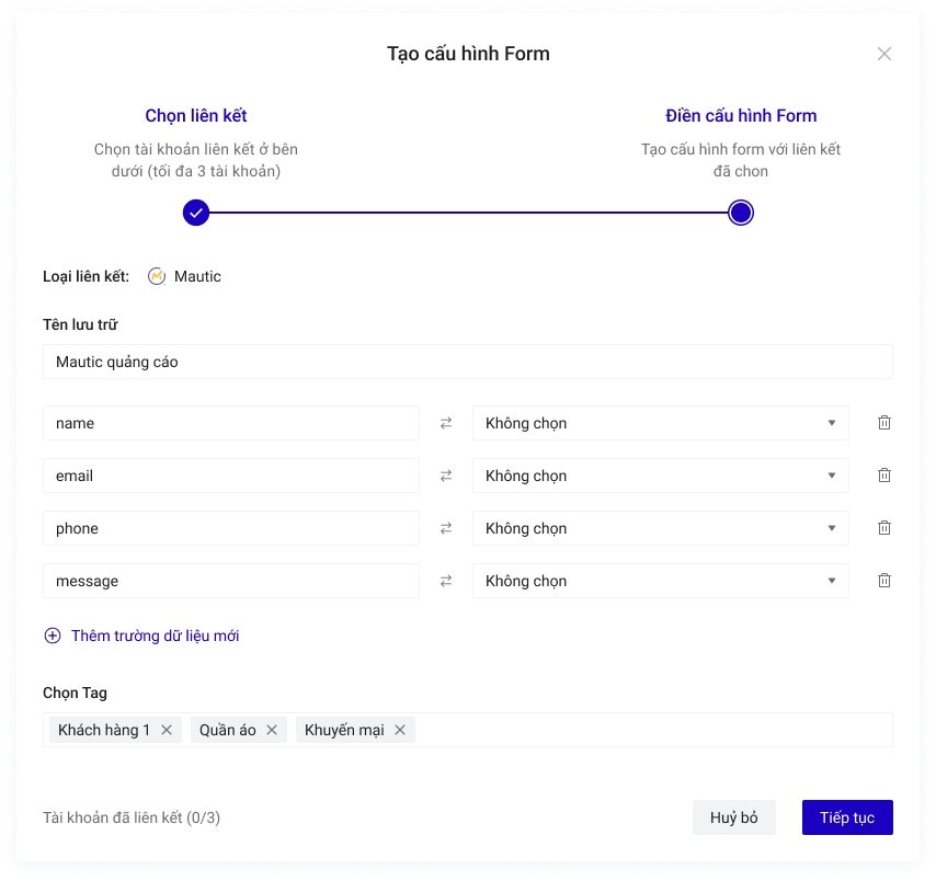 Bạn có thể chọn thêm tài khoản liên kết khác cho Cấu hình này. Mỗi cấu hình được chứa tối đa 3 tài khoản liên kết, tương đương với 3 nguồn lưu trữ thông tin khách hàng đồng thời nhận được từ form đăng ký trên Landing Page.