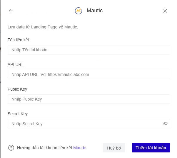 Public Key, Secret Key là key kết nối lấy trong tài khoản Mautic