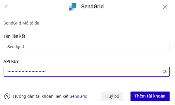 Cách 1 : Tạo tài khoản liên kết từ mục Cài đặt Truy cập trang builder.ladipage.comarrow-up-right, chọn menu Cài đặt -> Tích hợp-> Tài khoản liên kết. Sau đó lựa chọn Loại tài khoản là SendGrid