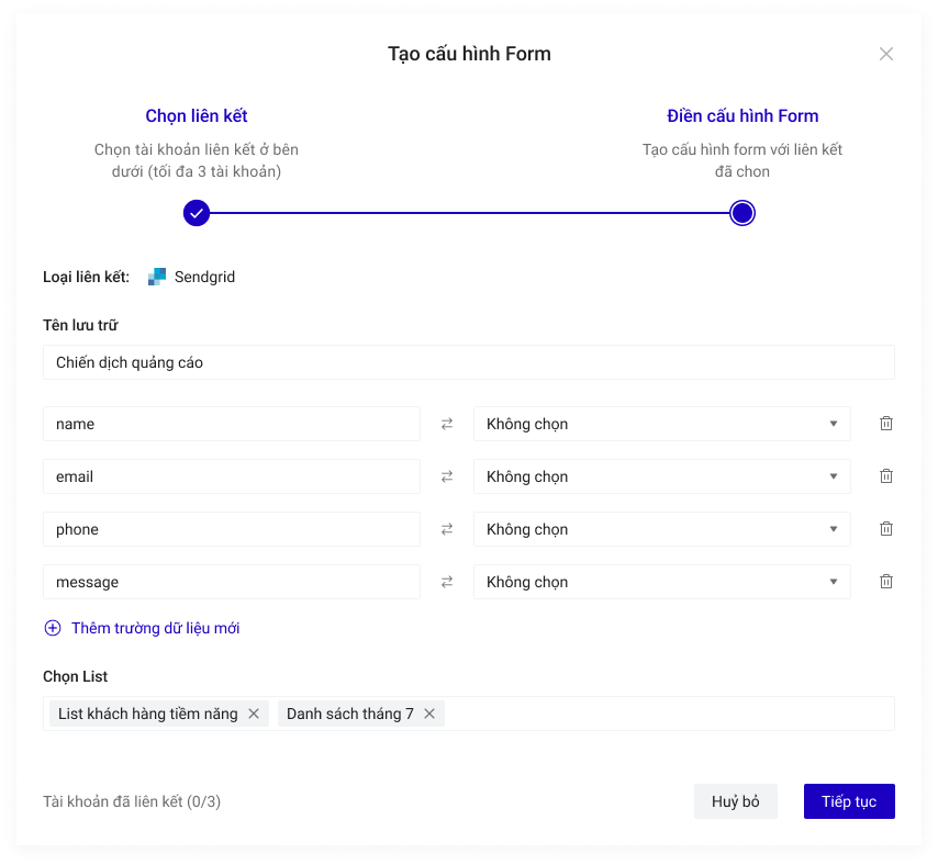 Bạn có thể chọn thêm tài khoản liên kết khác cho Cấu hình này. Mỗi cấu hình được chứa tối đa 3 tài khoản liên kết, tương đương với 3 nguồn lưu trữ thông tin khách hàng đồng thời nhận được từ form đăng ký trên Landing Page.
