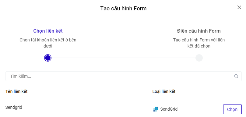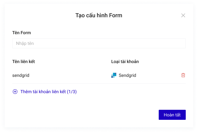 Truy cập trang builder.ladipage.comarrow-up-right, chọn menu Landing Pages -> Cấu hình form-> Tạo cấu hình form -> Form data -> Tạo tài khoản liên kết .Sau đó lựa chọn Loại tài khoản là SendGrid