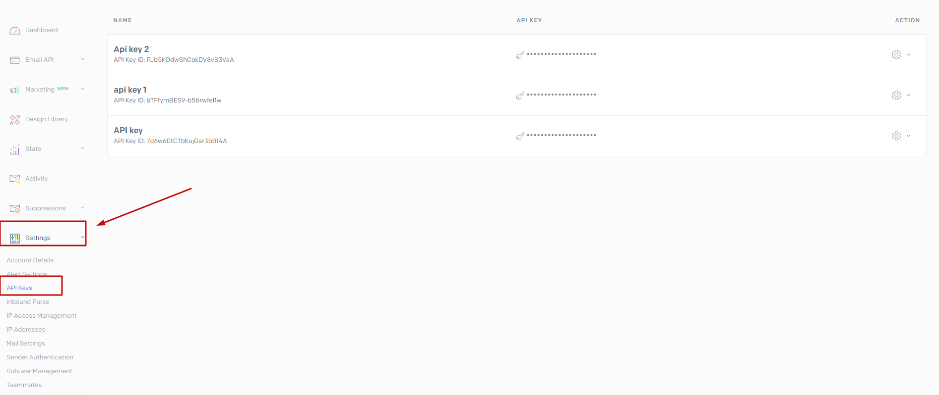 Đăng nhập tài khoản SendGrid > Settings > API keys