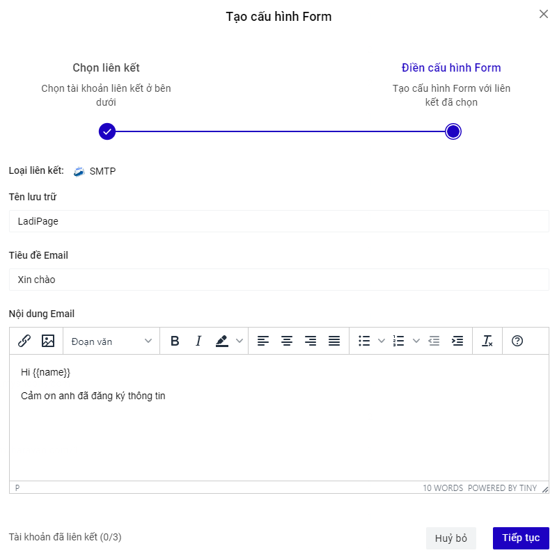 Bạn có thể chọn thêm tài khoản liên kết khác cho Cấu hình này. Mỗi cấu hình được chứa tối đa 3 tài khoản liên kết, tương đương với 3 nguồn lưu trữ thông tin khách hàng đồng thời nhận được từ form đăng ký trên Landing Page.