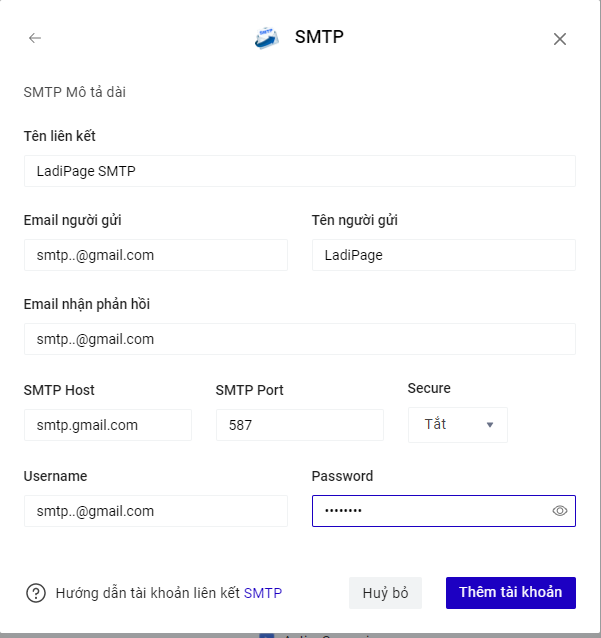 Cách 1 : Tạo tài khoản liên kết từ mục Cài đặt Truy cập trang builder.ladipage.com, chọn menu Cài đặt -> Tích hợp-> Tài khoản liên kết. Sau đó lựa chọn Loại tài khoản là SMTP