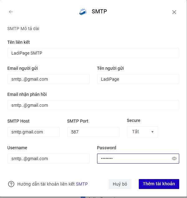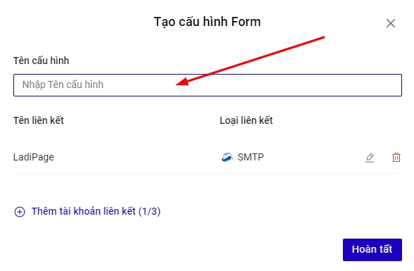 Truy cập trang builder.ladipage.com, chọn menu Landing Pages -> Cấu hình form-> Tạo cấu hình form -> Form data -> Tạo tài khoản liên kết .Sau đó lựa chọn Loại tài khoản là SMTP