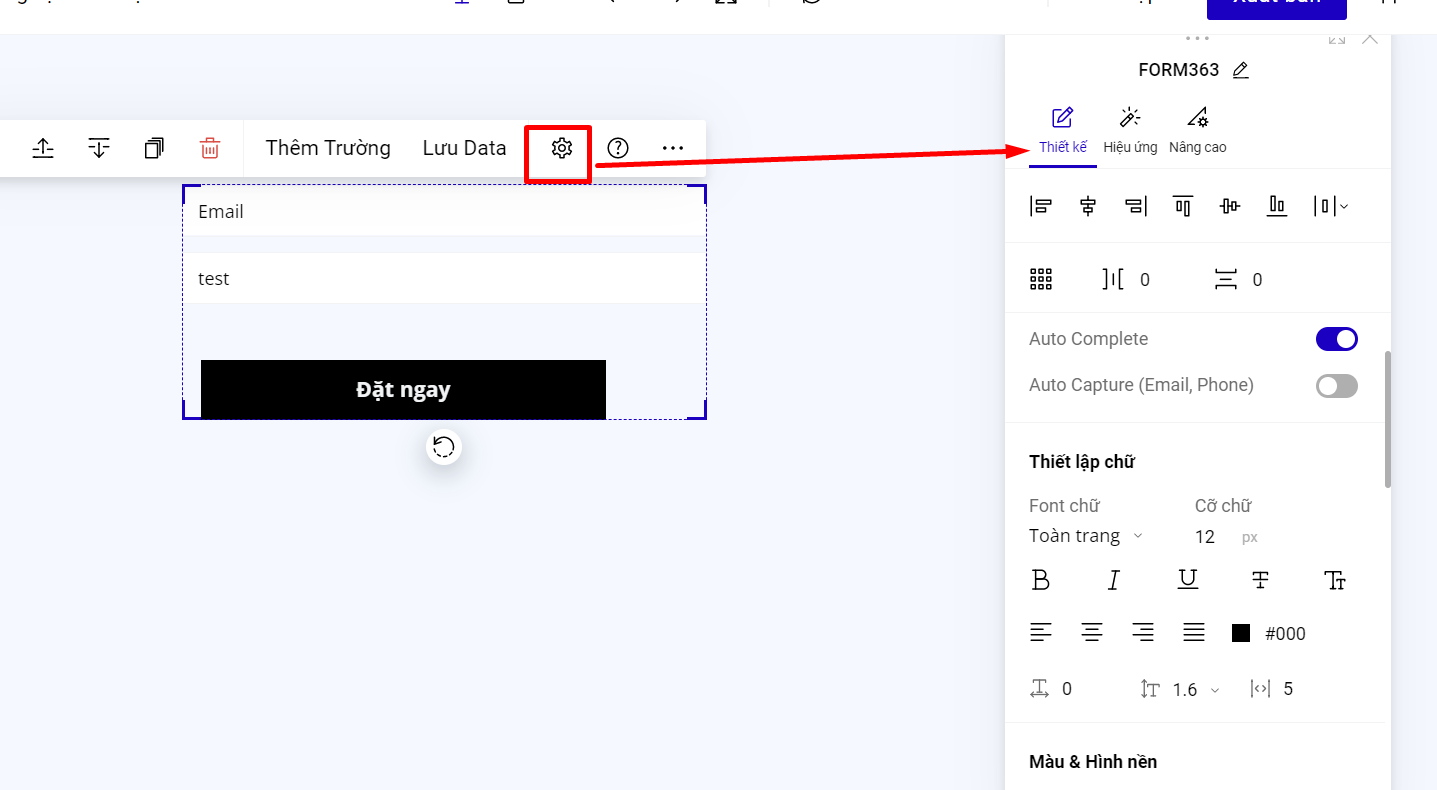 Bạn có thể thiết lập cho toàn form đăng ký bằng cách vào phần thiết lập của form--> Thiết kế.