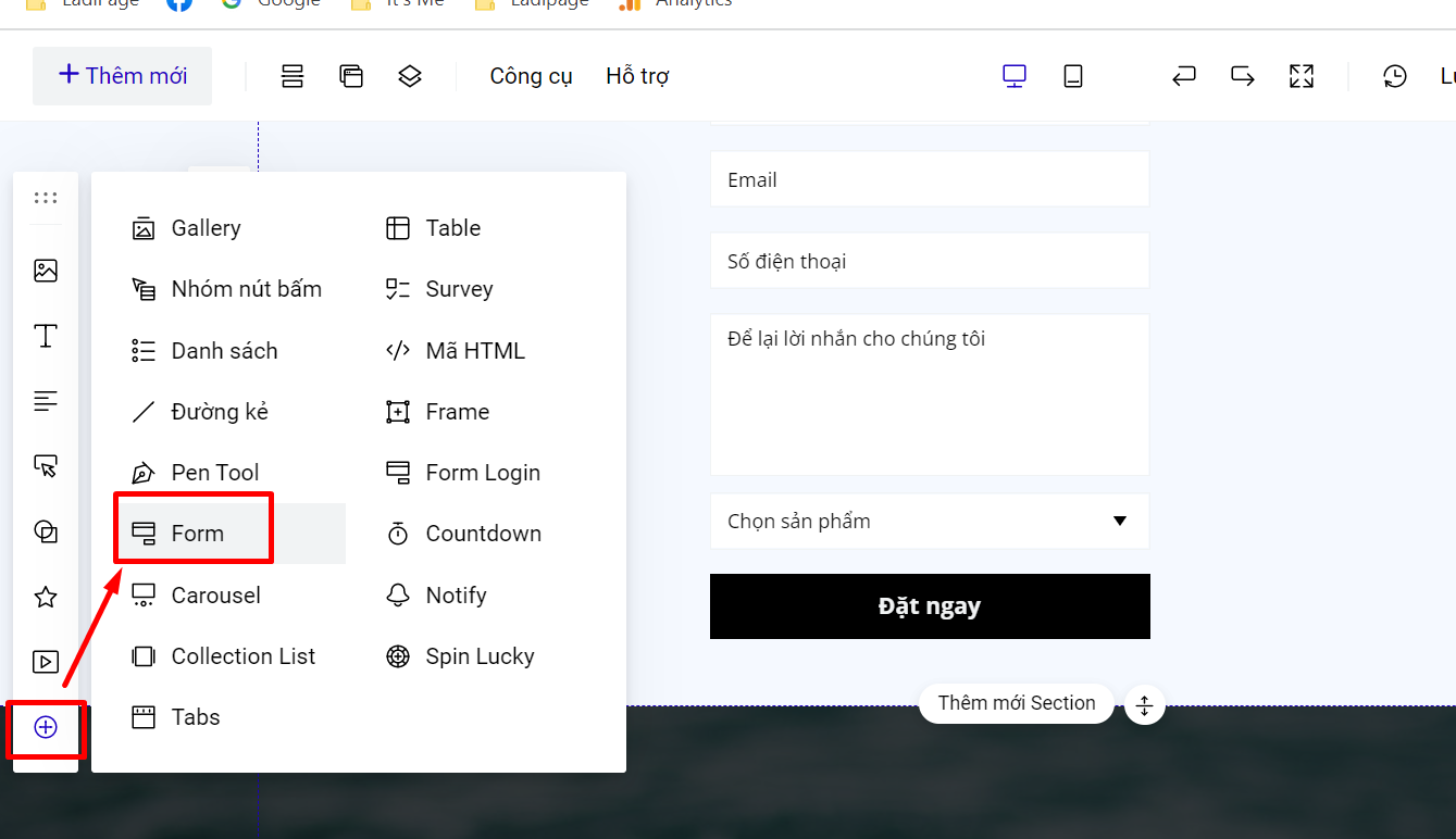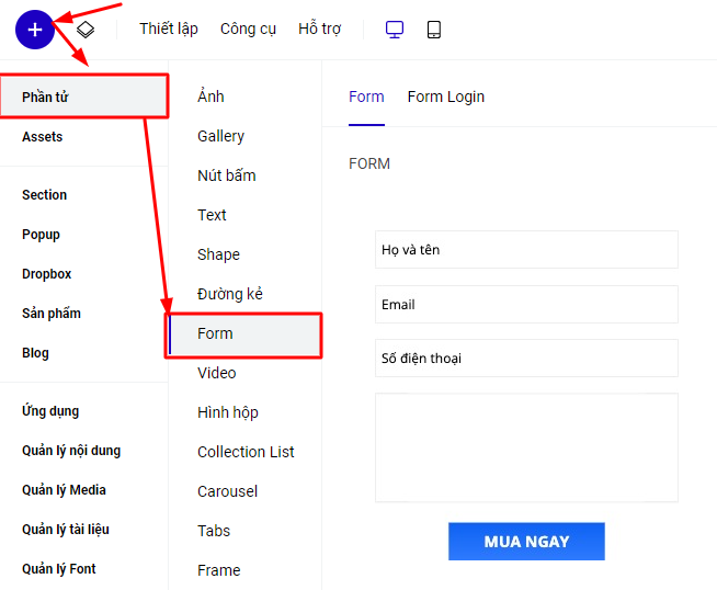 Để tạo form, bạn vào phần Thêm mới- Phần tử và chọn Form:
