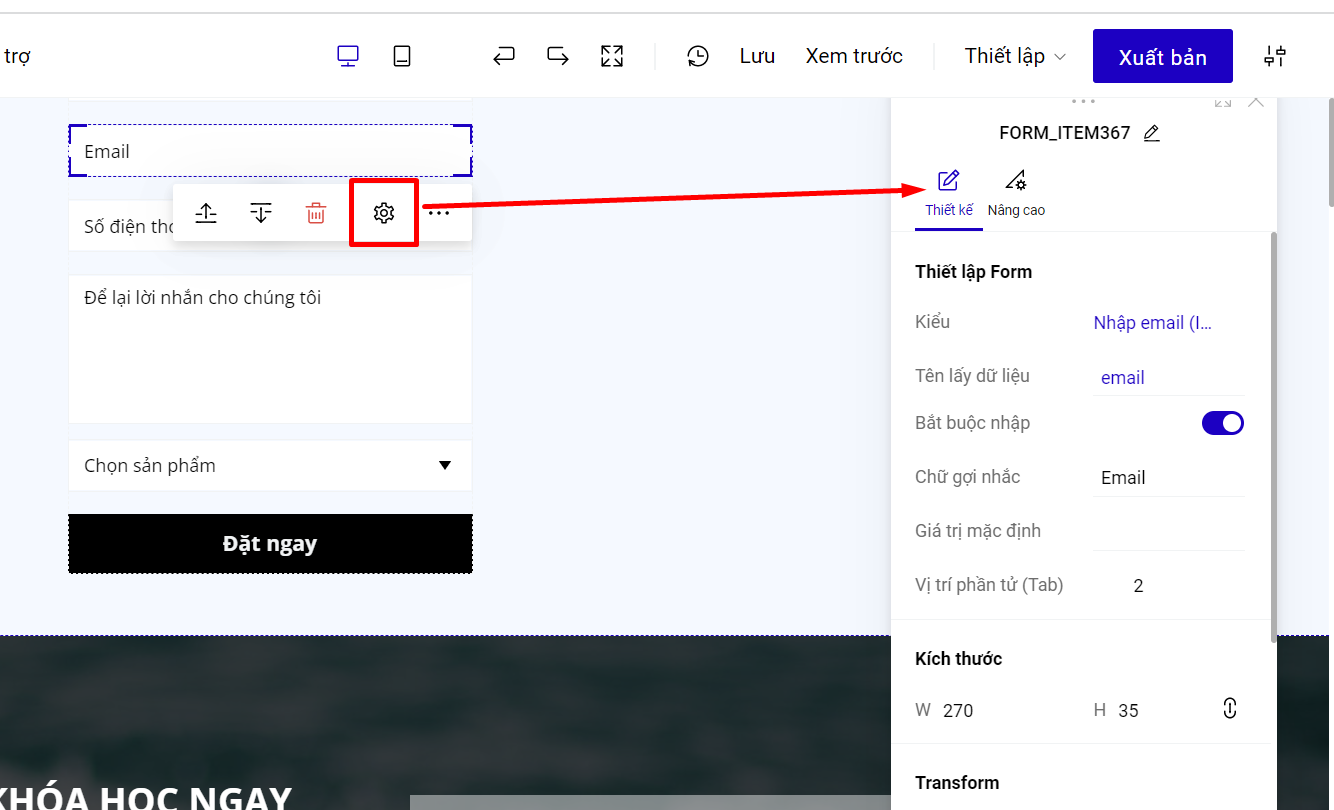 Đối với mỗi một trường thông tin, bạn có thể tuỳ chỉnh Xoá, Sửa chữ, hoặc cài đặt để người truy cập Bắt buộc nhập hay không. Bạn chọn vào từng trường thông tin muốn chỉnh sửa, chọn biểu tượng Thiết lập.