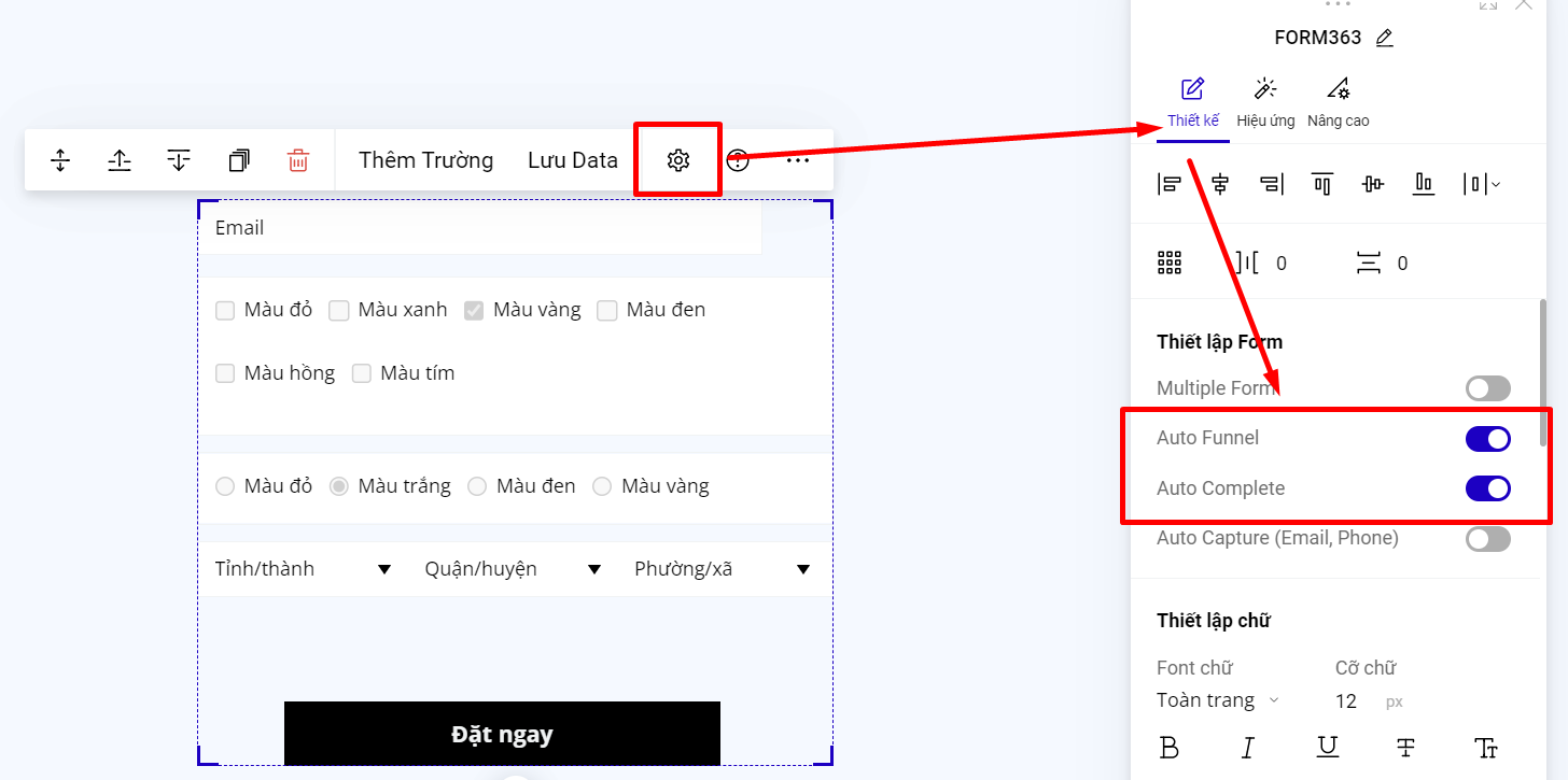 Để sử dụng Auto Funnel và Auto Complete bạn vào phần thiết lập của form--> bật Có Auto Funnel và Auto Complete.