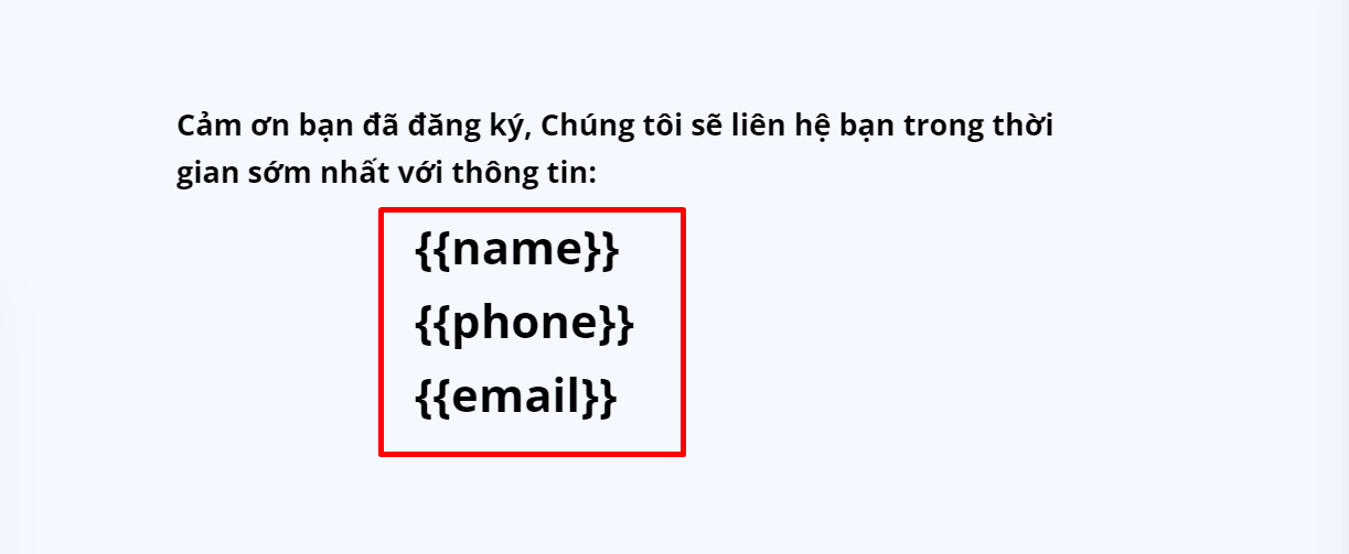 Trên trang cảm ơn riêng, popup cảm ơn riêng hoặc popup cảm ơn mặc định bạn thêm văn bản có mẫu {{tênlấydữliệu}} ví dụ như sau: