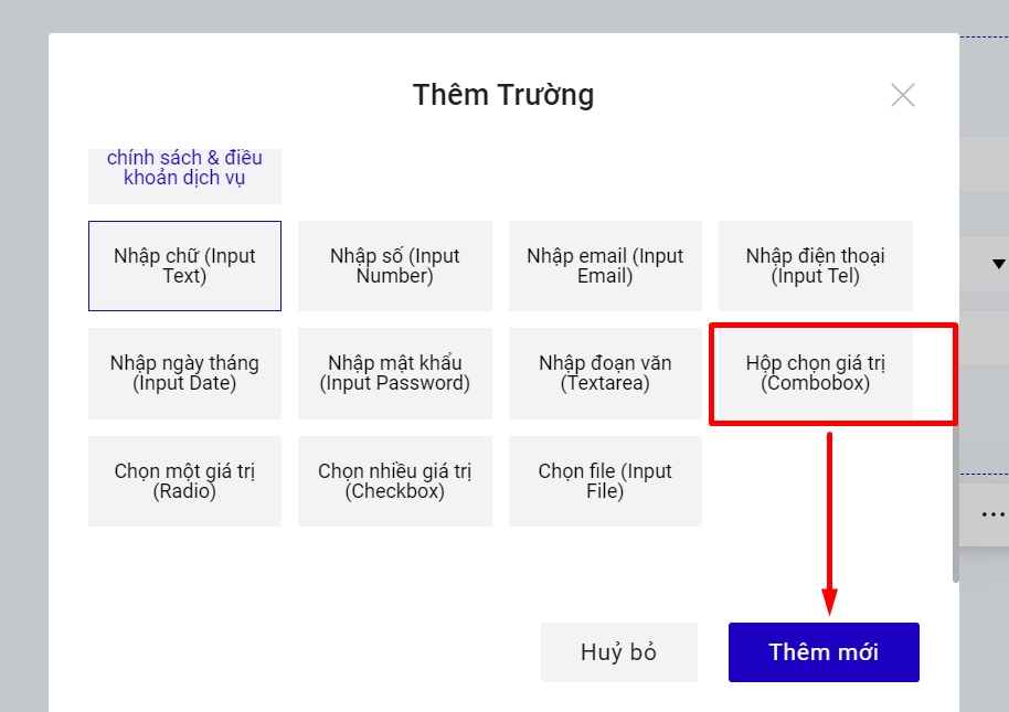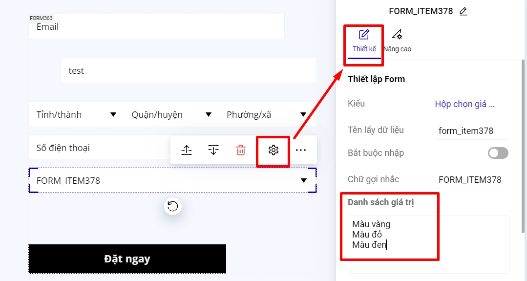 Để thiết lập bạn chọn trường "Hộp chọn giá trị". Trong ô điền Danh sách giá trị, bạn điền giá trị sau đó enter xuống dòng để mỗi giá trị là một dòng như ví dụ hình dưới: