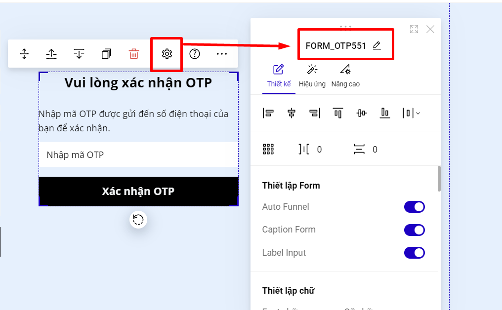 Hành động Ẩn/hiện phần tửarrow-up-right: Sau khi thông tin trên form chính sẽ hiển thị ra OTP Form. Bạn cũng có thể ẩn Form chính khi sử dụng hành động Ẩn/hiện phần tử này.
