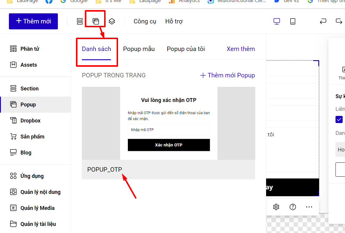 Đồng thời tại danh sách Popup của bạn sẽ tự động thêm Popup_OTP.