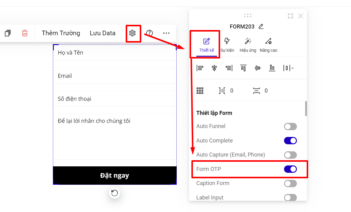 Form OTP sẽ không có phần Thêm trường, Lưu data, Auto complete và Auto capture.