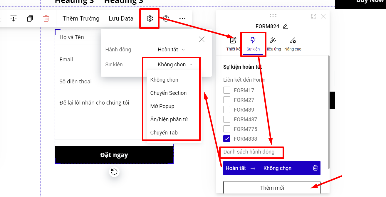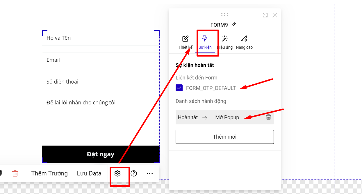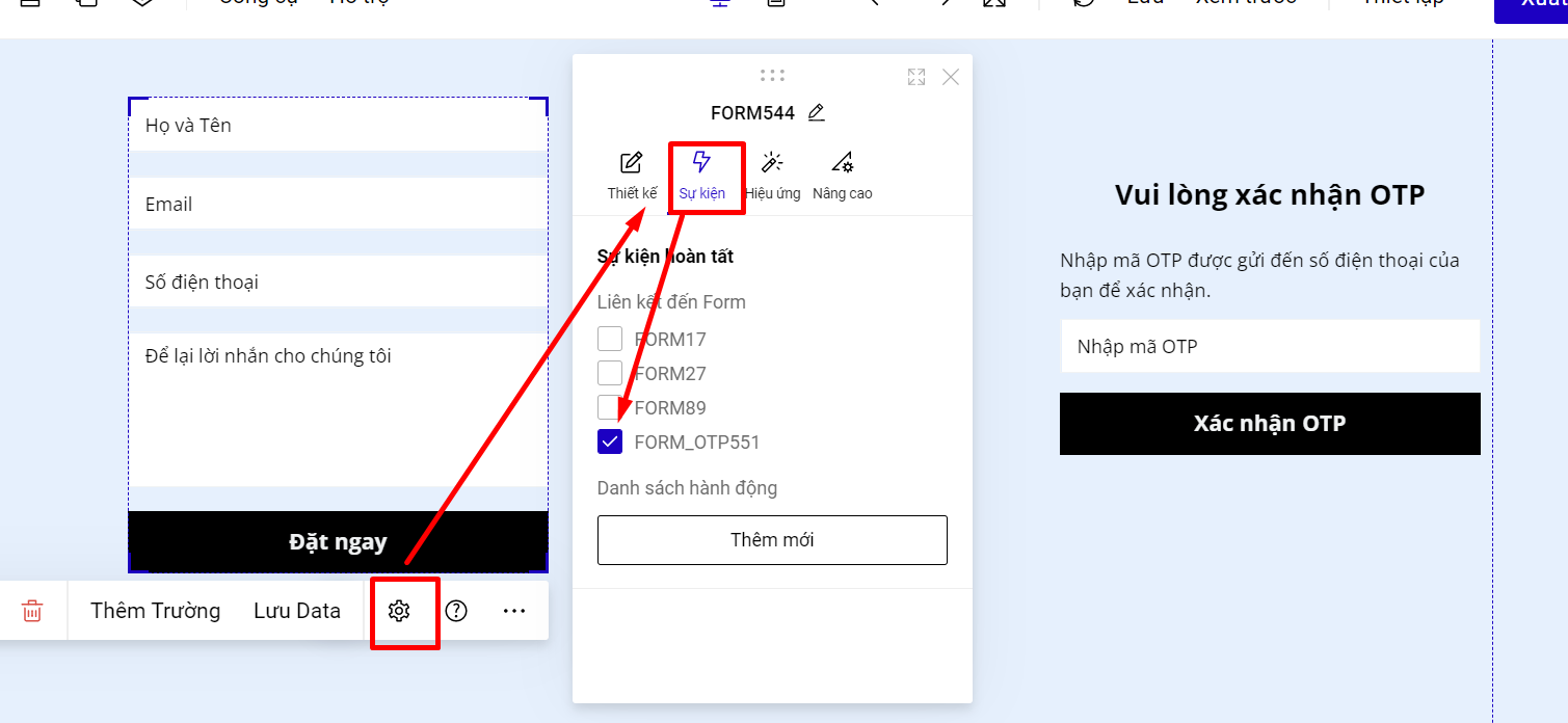 • Sự kiện hoàn tất: Bạn cần liên kết Form chính tới Form OTP tại phần sự kiện. Bạn tích chọn vào ID Form OTP mà bạn tạo Form OTP tại bước 2.
