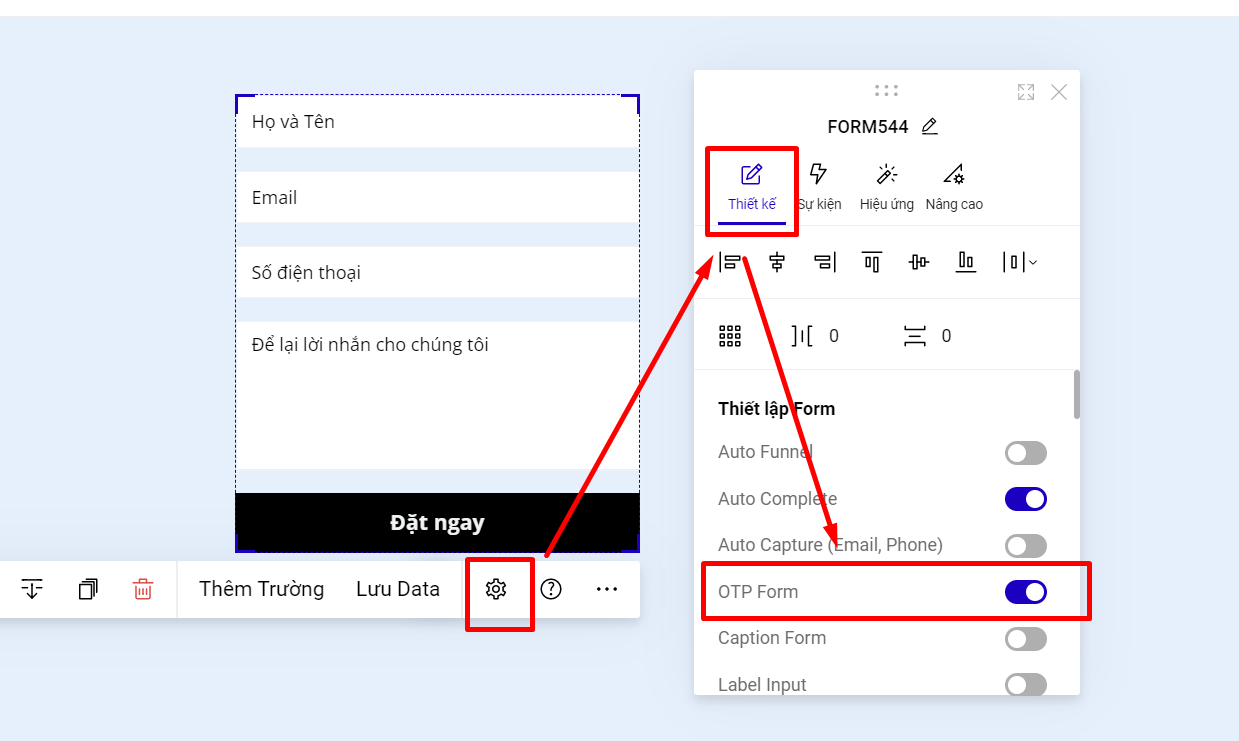 Tại form đăng ký chính, bạn bật OTP Form để sử dụng.