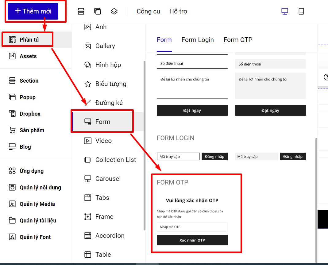 • Bạn cần tạo Form OTP bằng cách vào mục Thêm mới --> Phần tử --> Form --> Chọn Form OTP ở cuối danh sách Form.