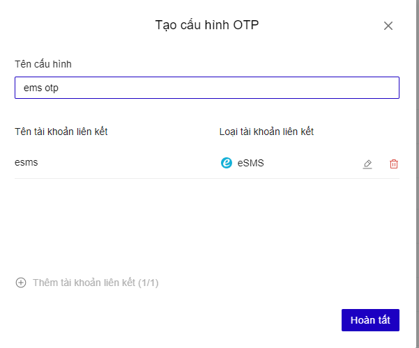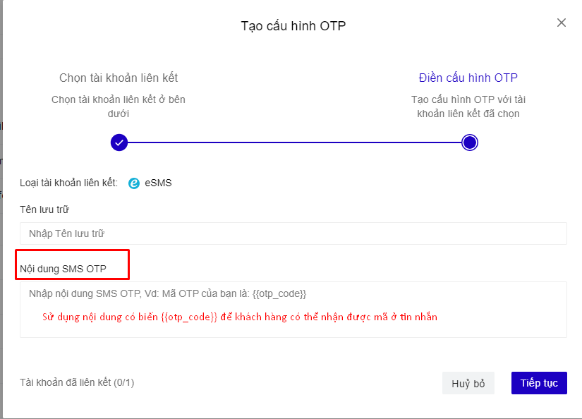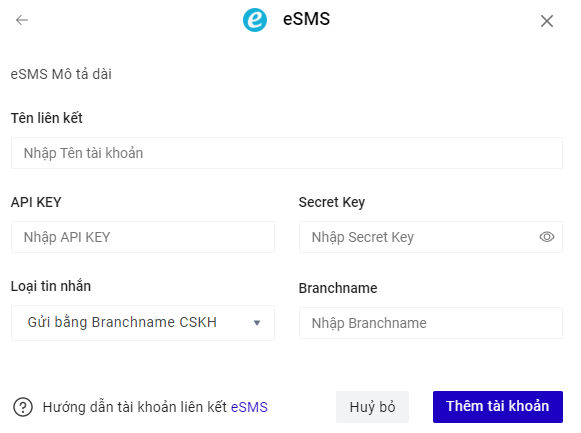 Chọn sử dụng tài khoản liên kết eSMS đã tạo