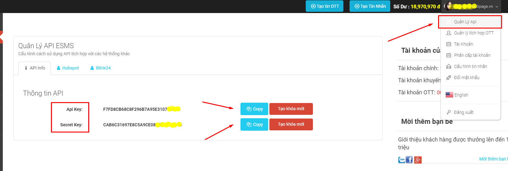 *Cách lấy API KEY, Secret Key trong eSMS