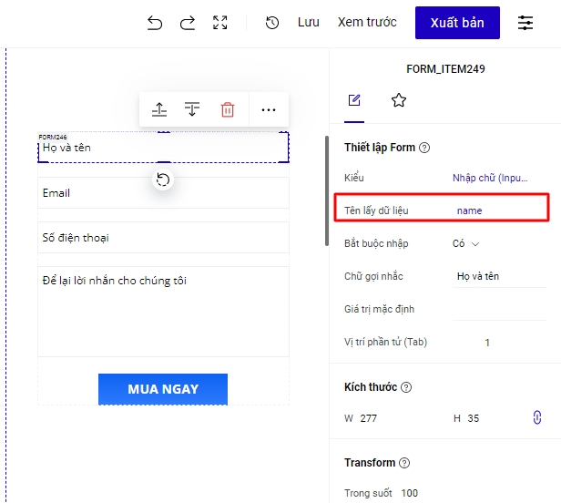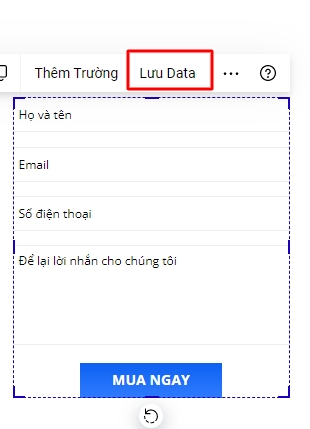 Nếu bạn tạo nhóm form với các phần tử khác, bạn bấm chuột trái 2-3 lần để chọn đúng form đăng ký và hiện phần Lưu Data.