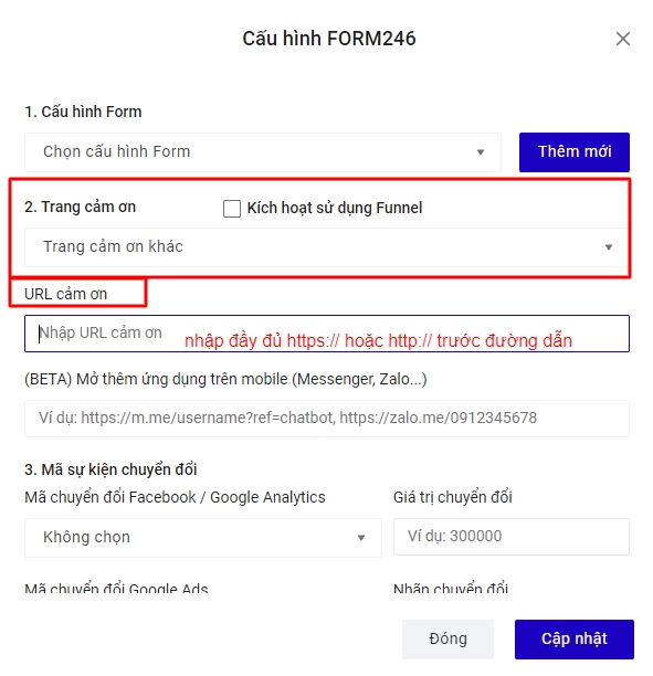 Sau khi khách hàng hoàn thành điền form thông tin, bạn cũng có thể điều hướng họ về website chính, trang cộng đồng hoặc một trang thông tin bán chéo sản phẩm khác. Để thiết lập, bạn chọn phần Trang cảm ơn khác trong mục Trang cảm ơn, và điền đường dẫn trang bạn muốn điều hướng đến.