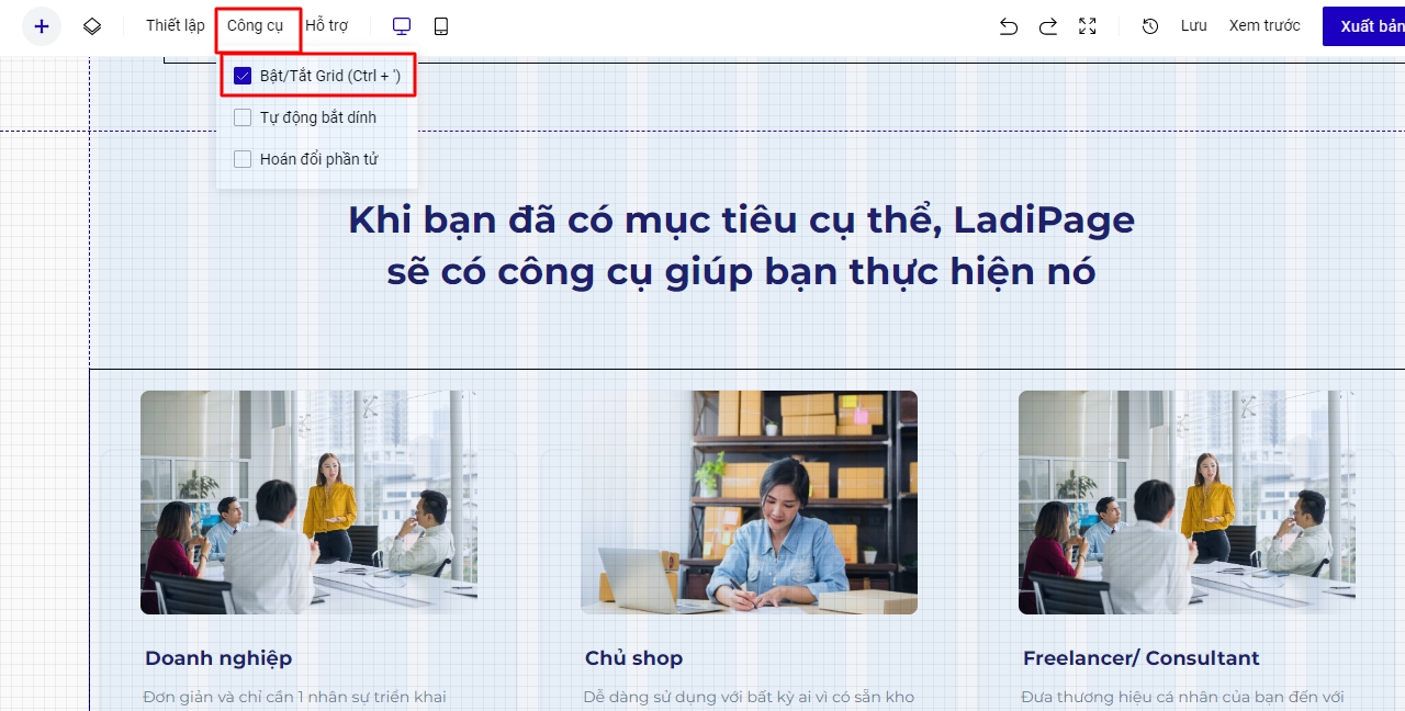 Grid là các ô lưới được chia nhỏ để giúp bạn dóng và điều chỉnh các phần tử vào vị trí dễ dàng hơn: